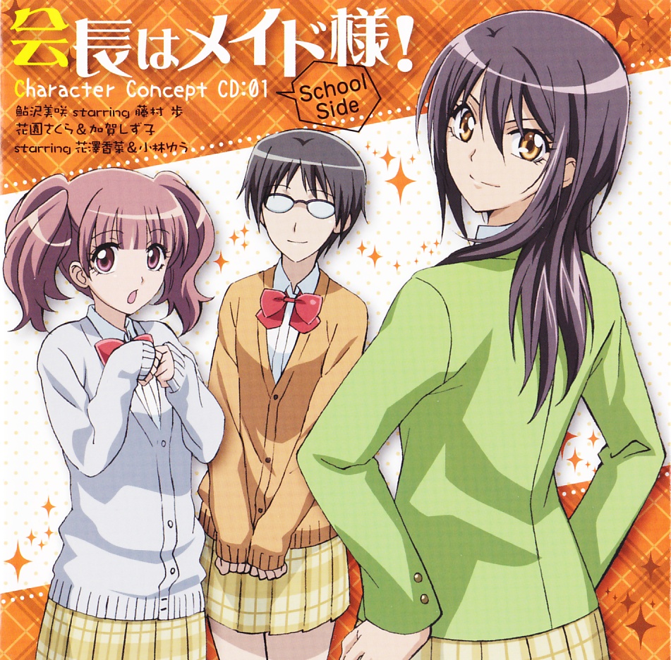 4月スタートのTVアニメ「会長はメイド様!」キャラクターの魅力満載のCD、発売!! ドラマとキャラクターソングの構成で、「メイド様!」の魅力をCDでお届け。第1弾は主人公・鮎沢美咲の”お昼の顔”をフィーチャーし、学校でのキャラクター魅力に迫る!! 親友のさくら、しず子も出演で、美咲ファンならずとも逃せない1枚。